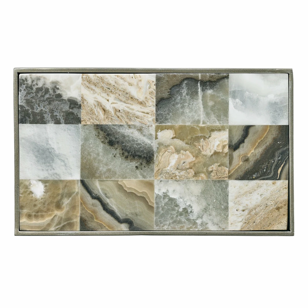 The soft curves of the metal base design with the rigidity of rectangular top provide subtle contrast. The inset parquet top is an onyx acoriris that blends with the silver leafed metal.