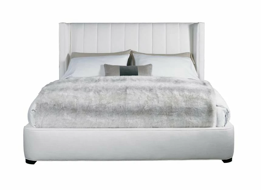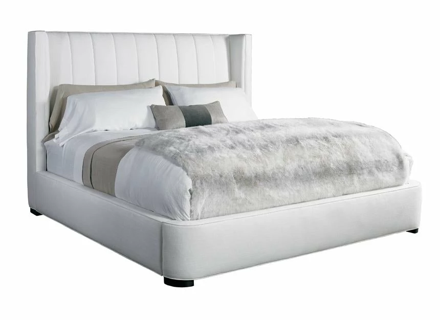 Fully Upholstered channeled wing bed with shaped footboard and side rails and exposed wood legs that are available in choice of finish.