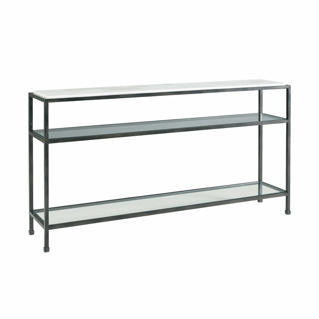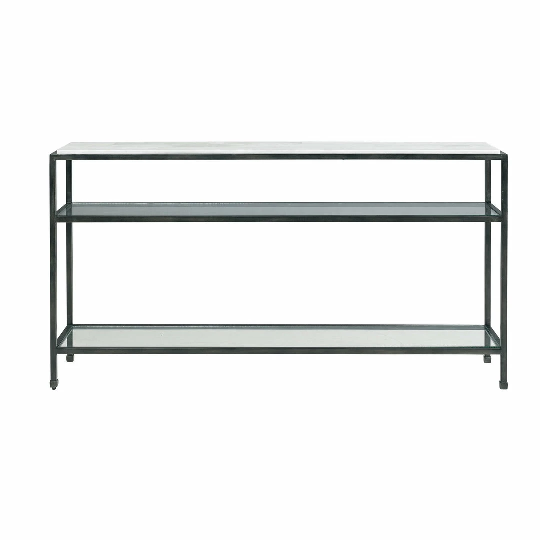 The Stef Console is an all metal frame in an black industrial finish with clear lower glass shelves and a travertine top that adds an unexpected and pleasing blend of materials.