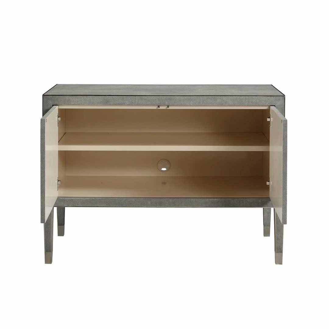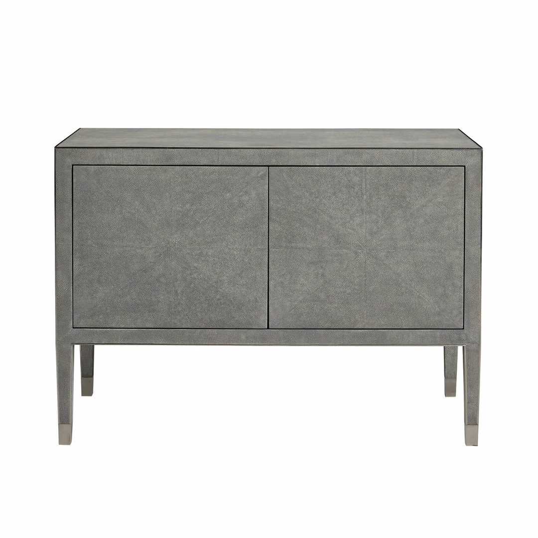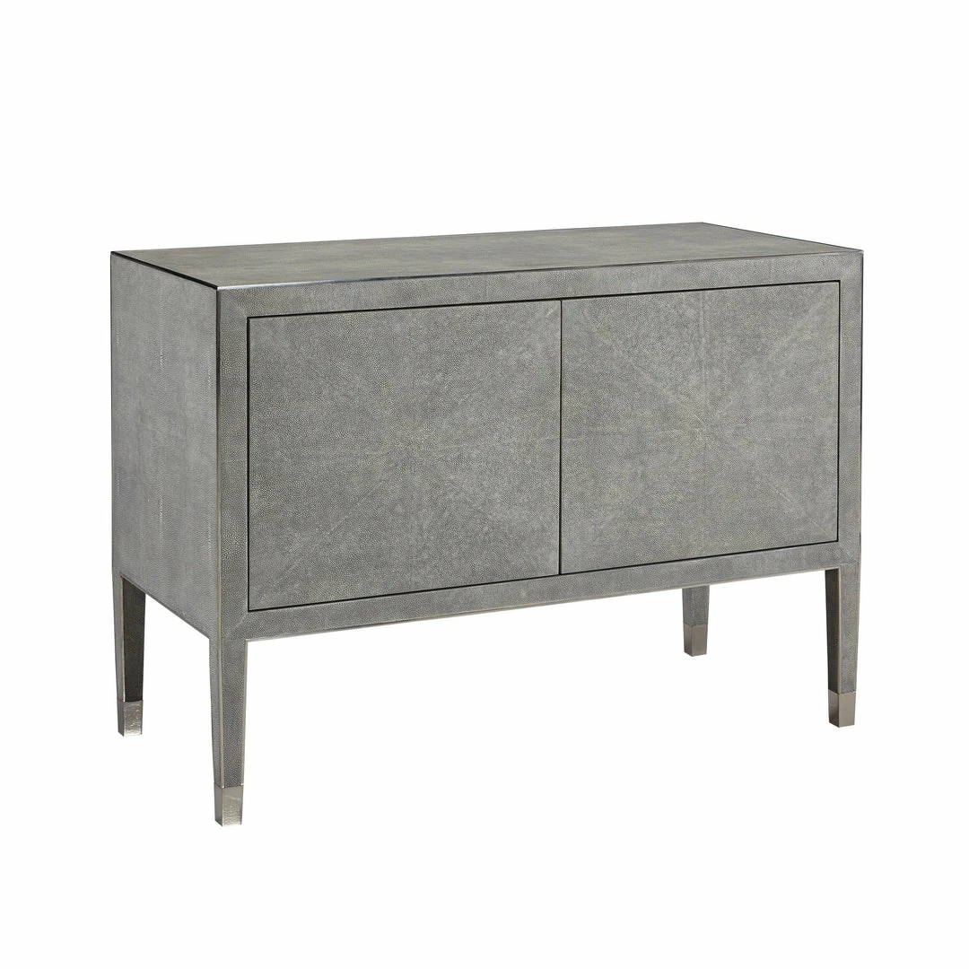 The Claude Two Door Cabinet has very clean lines interrupted by door hardware with its touch latch hinges. All surfaces are dove grey faux shagreen with trim and ferrules in a polished stainless.