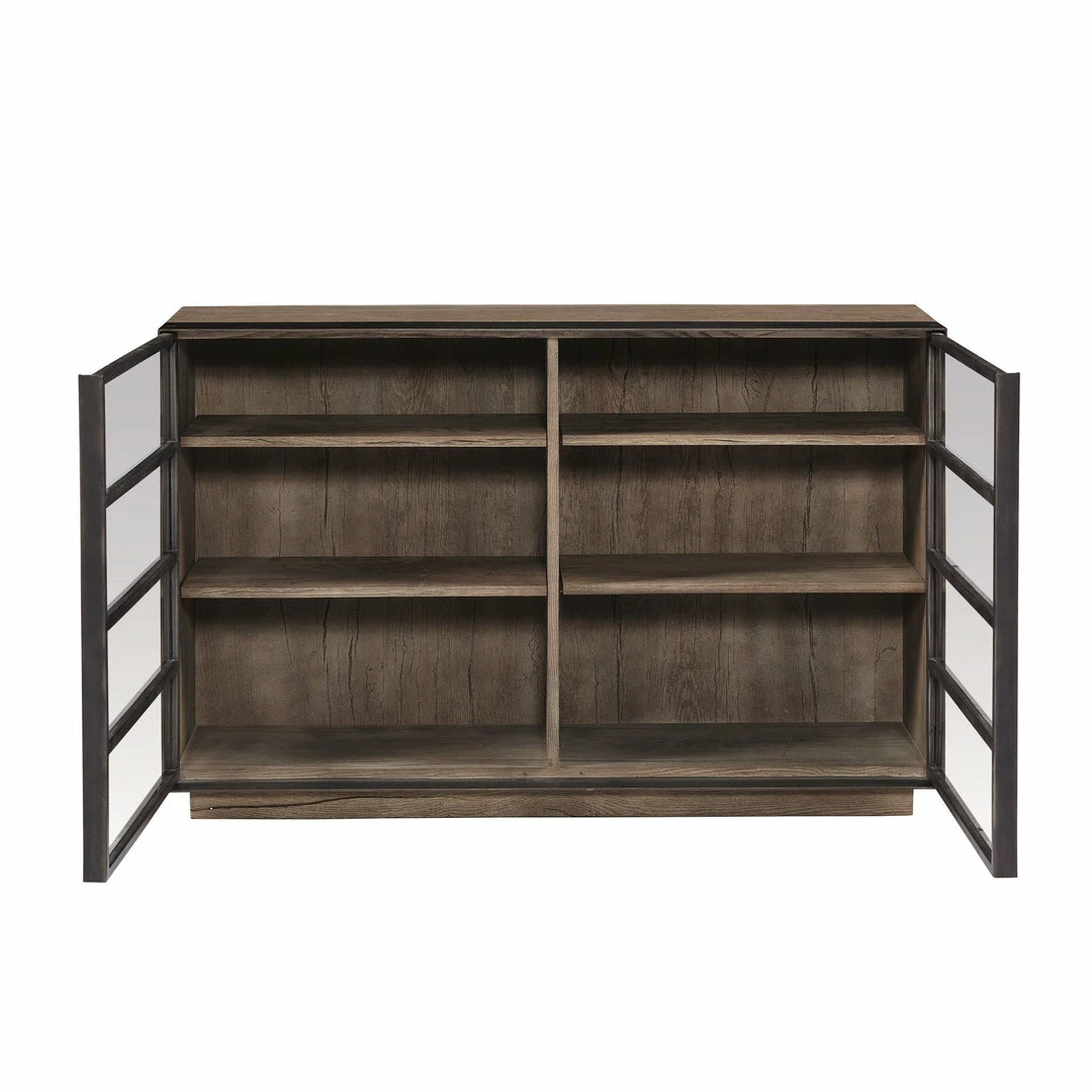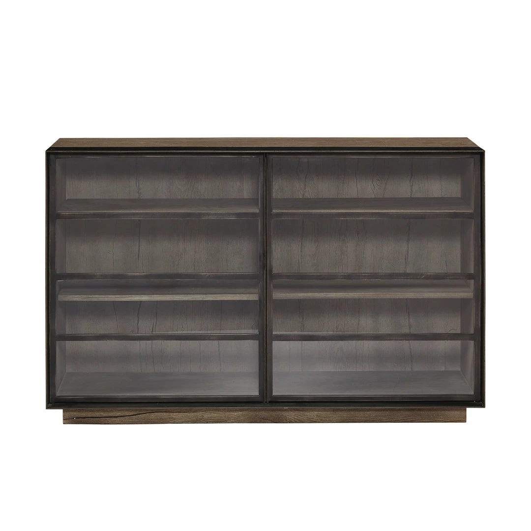 Oak Solids and veneers with Metal Accents, Clear Glass French Industrial style book console constructed of oak with aged bronze metal accents around the door frames, a wood plinth base, two wood shelves, and clear glass doors.