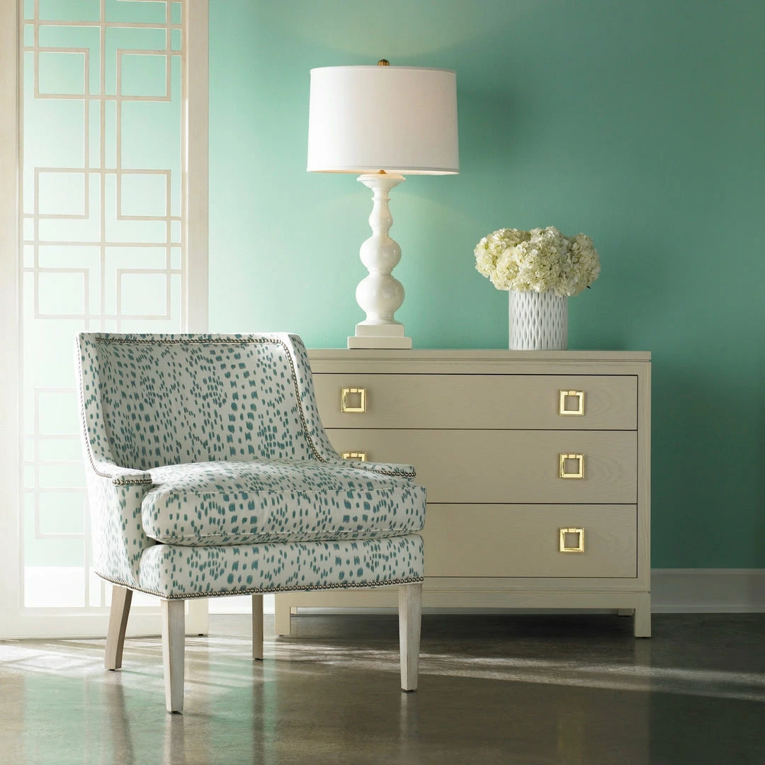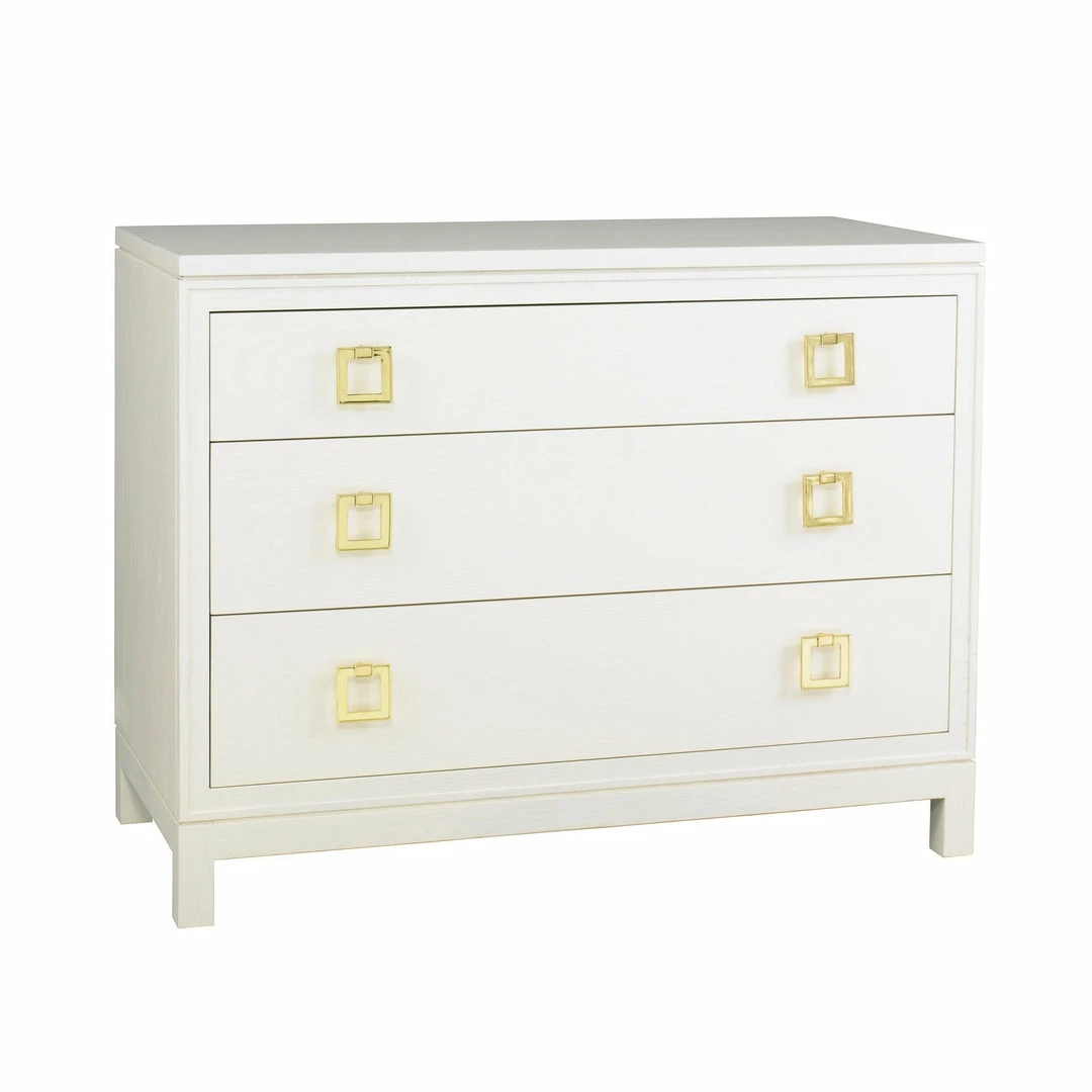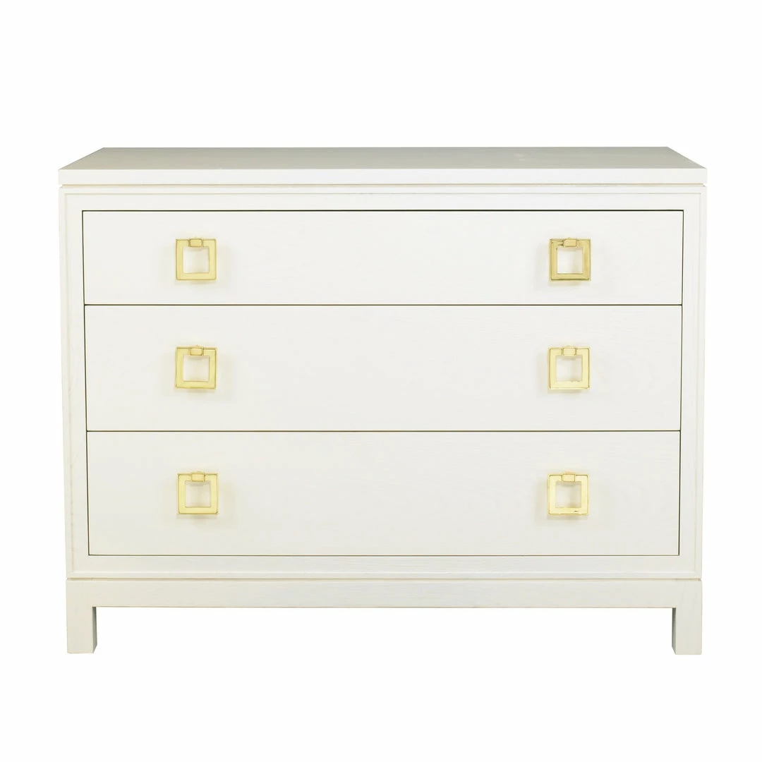 Three drawers with a handsome pair of square drop pulls per drawer adding a jewelry touch to it’s modern mid-century sensibility. Ash solids veneers with a choice of either Polished Brass or Nickel hardware.