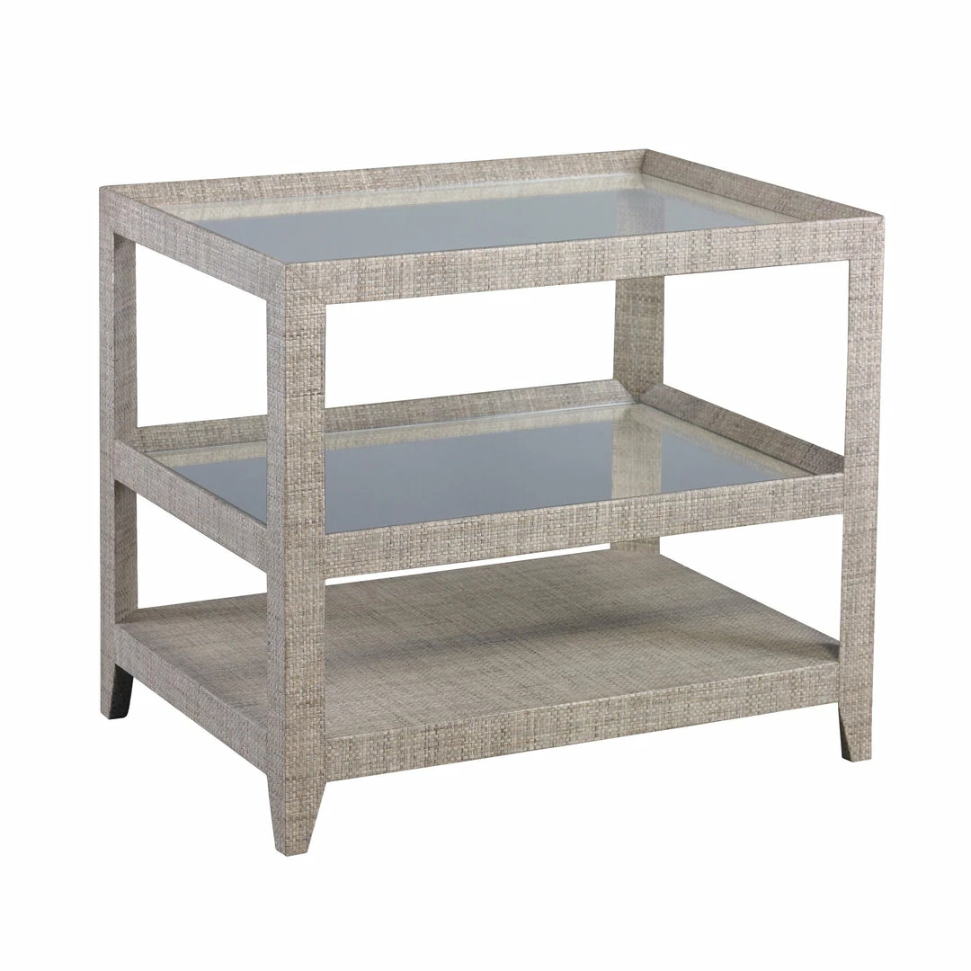 This Elle collection tiered side table offers fully upholstered textured grey-beige grass cloth surfaces with mid-shelf and top of clear glass.