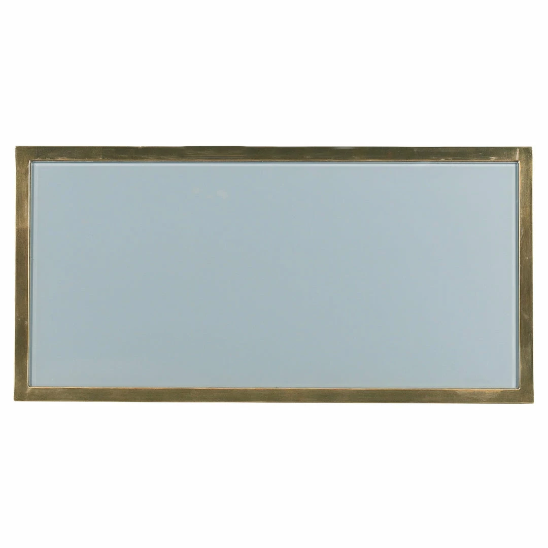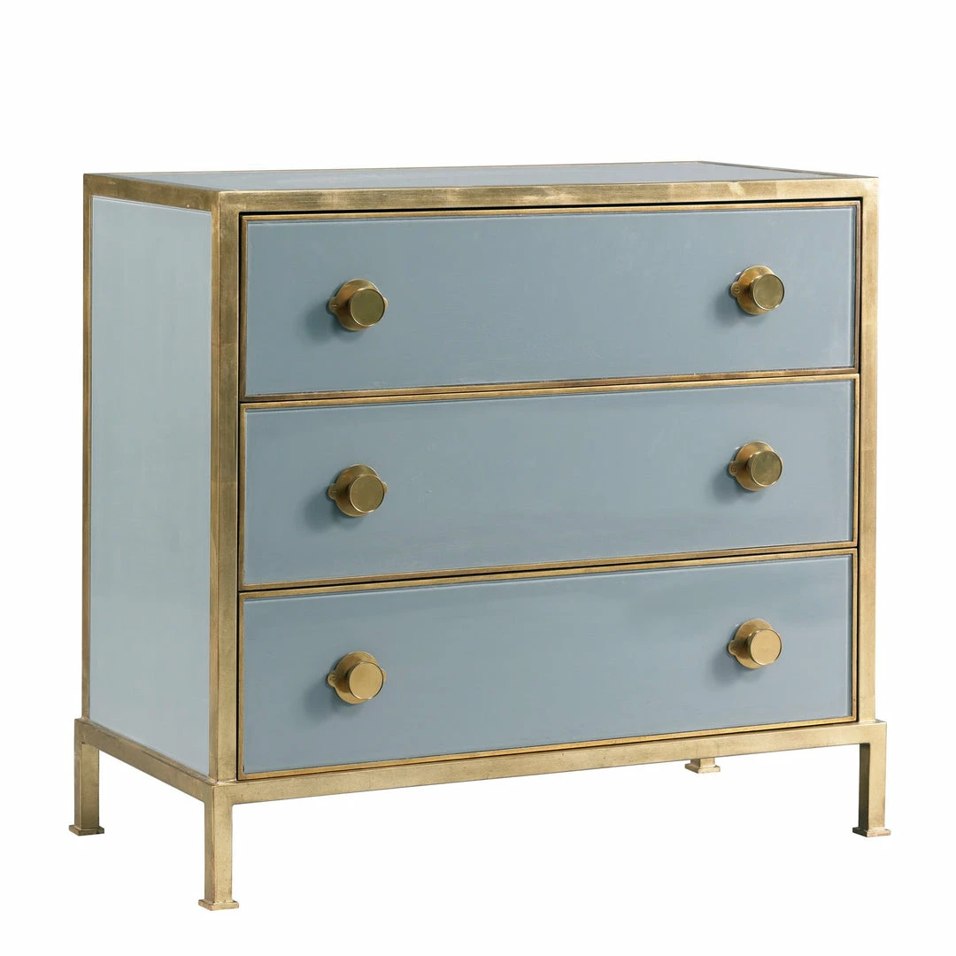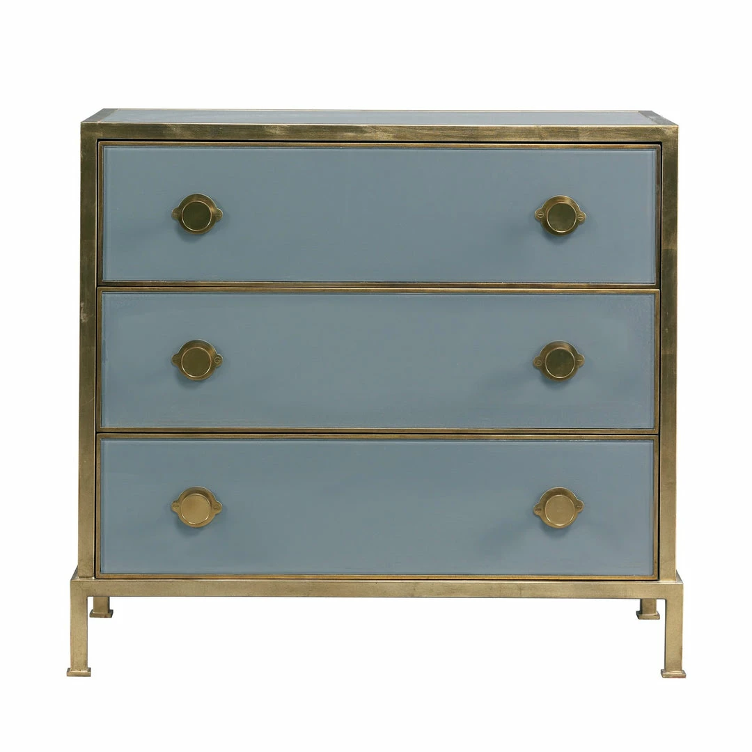 An acacia wood chest completely paneled with reverse painted glass and bordered with a steel frame and legged base in an aged brass finish. Three drawers with handsome hardware matching the framing.