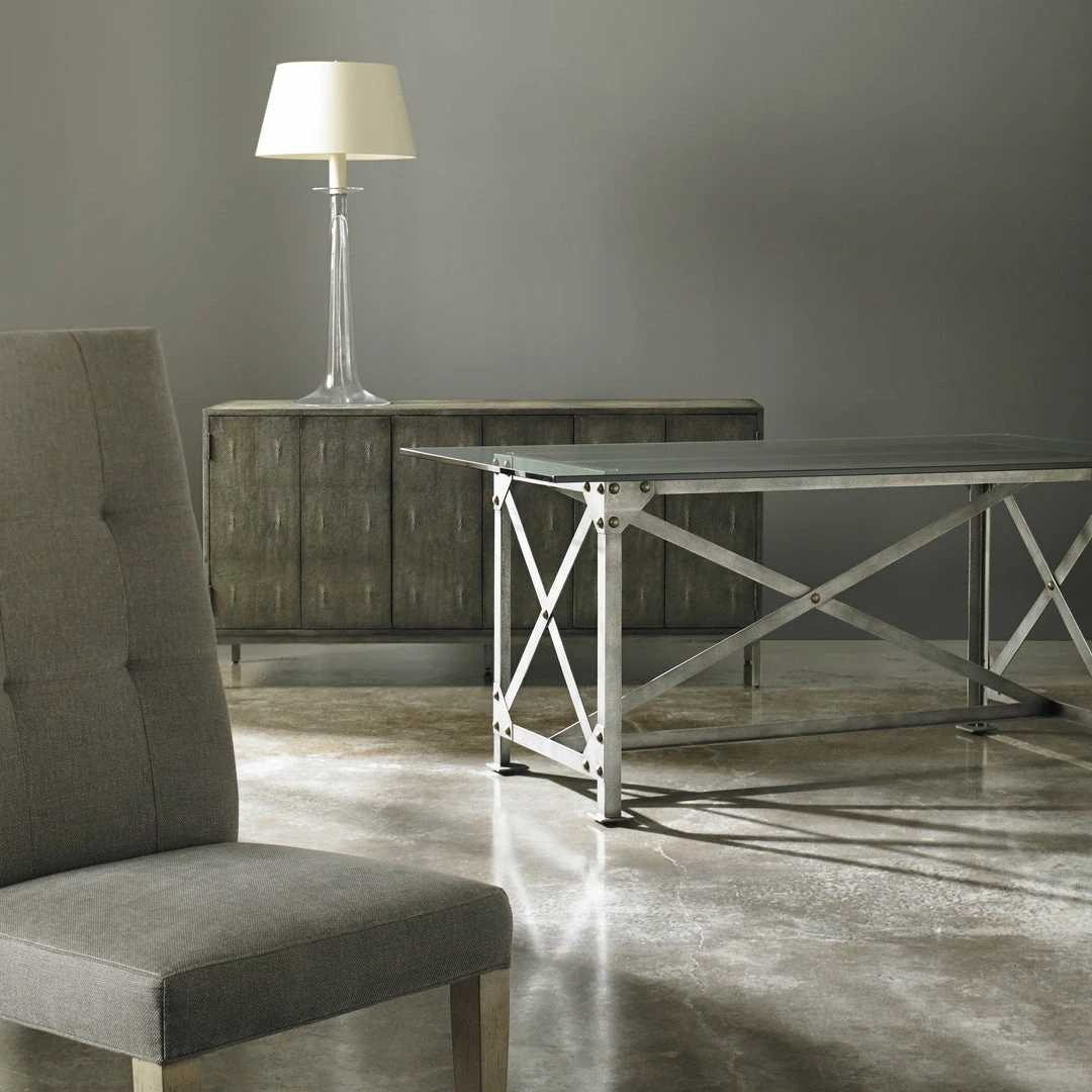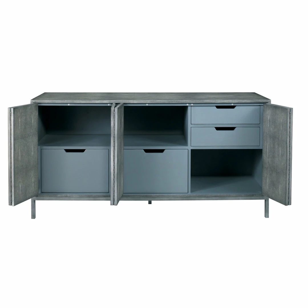 A new Charcoal shagreen color-way with Nickel finished base provides new dimension to the Ford Shagreen Console. This highly functional cabinet adds both charm and function to the urban home-office / dining room for which it was designed.