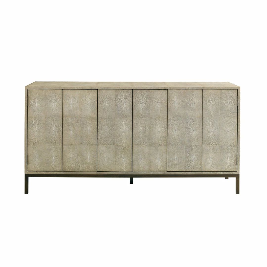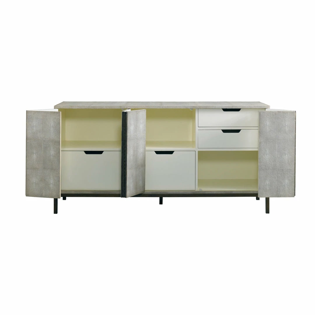 The Ford credenza was designed to serve with dining or home office purposing. Taupe Shagreen and Bronzed iron with cream lacquer interior housing file drawers and shelving.