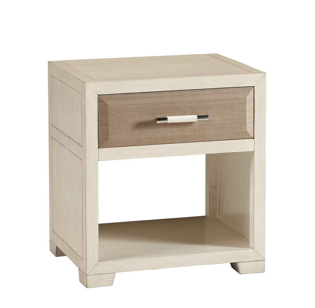 The Greco collection features oak solids and veneers that combine a dove-like finish with taupe linen fabric surfaces highlighted with polished nickel and faux bone hardware.