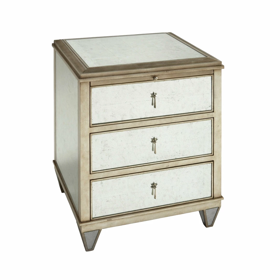Three workable drawers with eglomise front panels. Pull-out tray above top drawer.