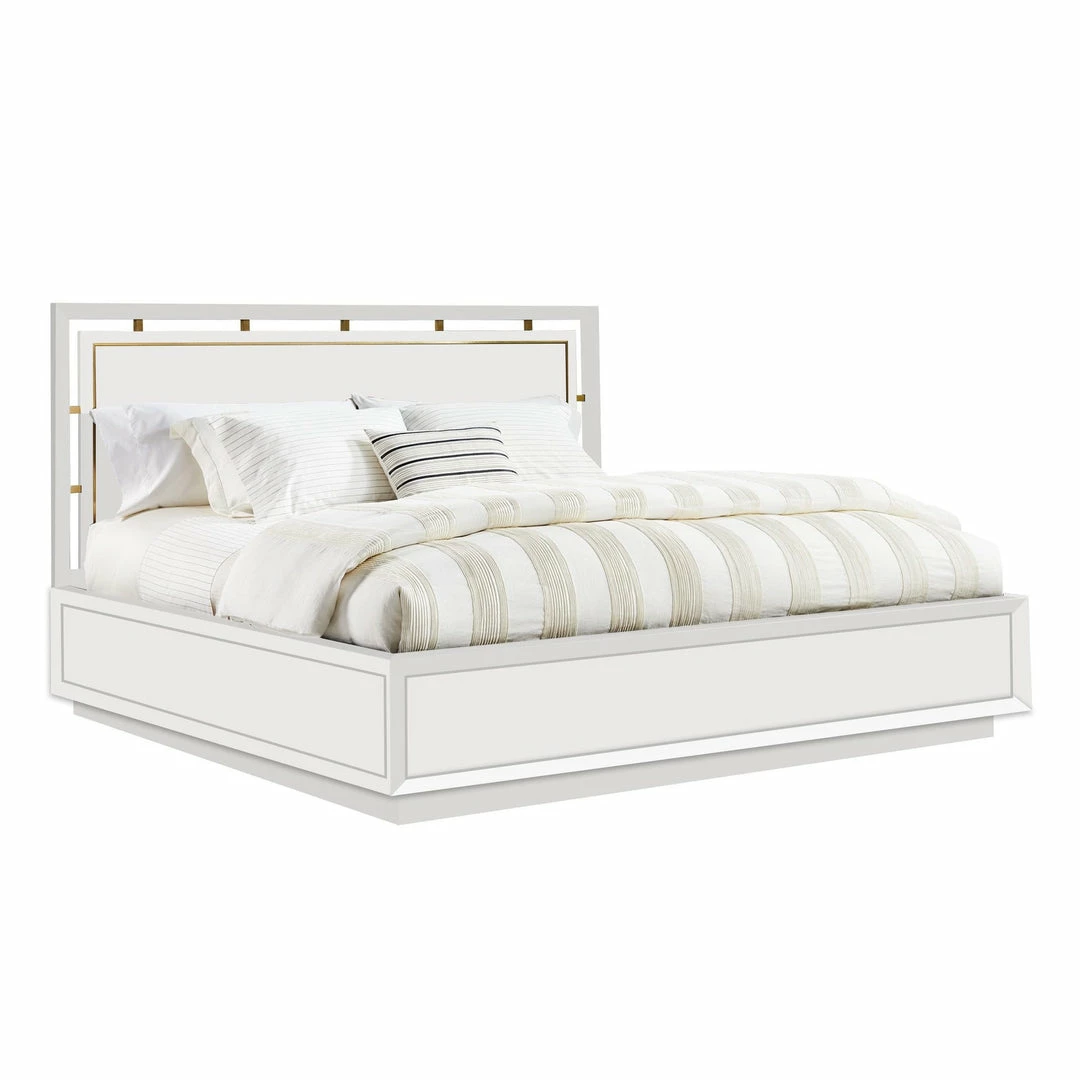 The Julien Bed features snow veneers accented with brass on the headboard. The platform style base is designed with deep, mitered inset panels adding a true artisan quality appearance.