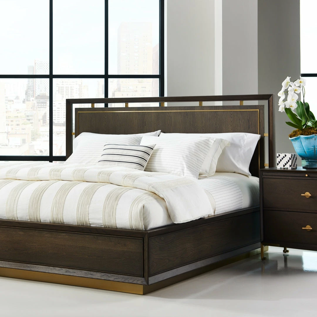 The Julien Bed features smokey grey veneers accented with brass on the headboard. The platform style base is designed with deep, mitered inset panels adding a true artisan quality appearance.