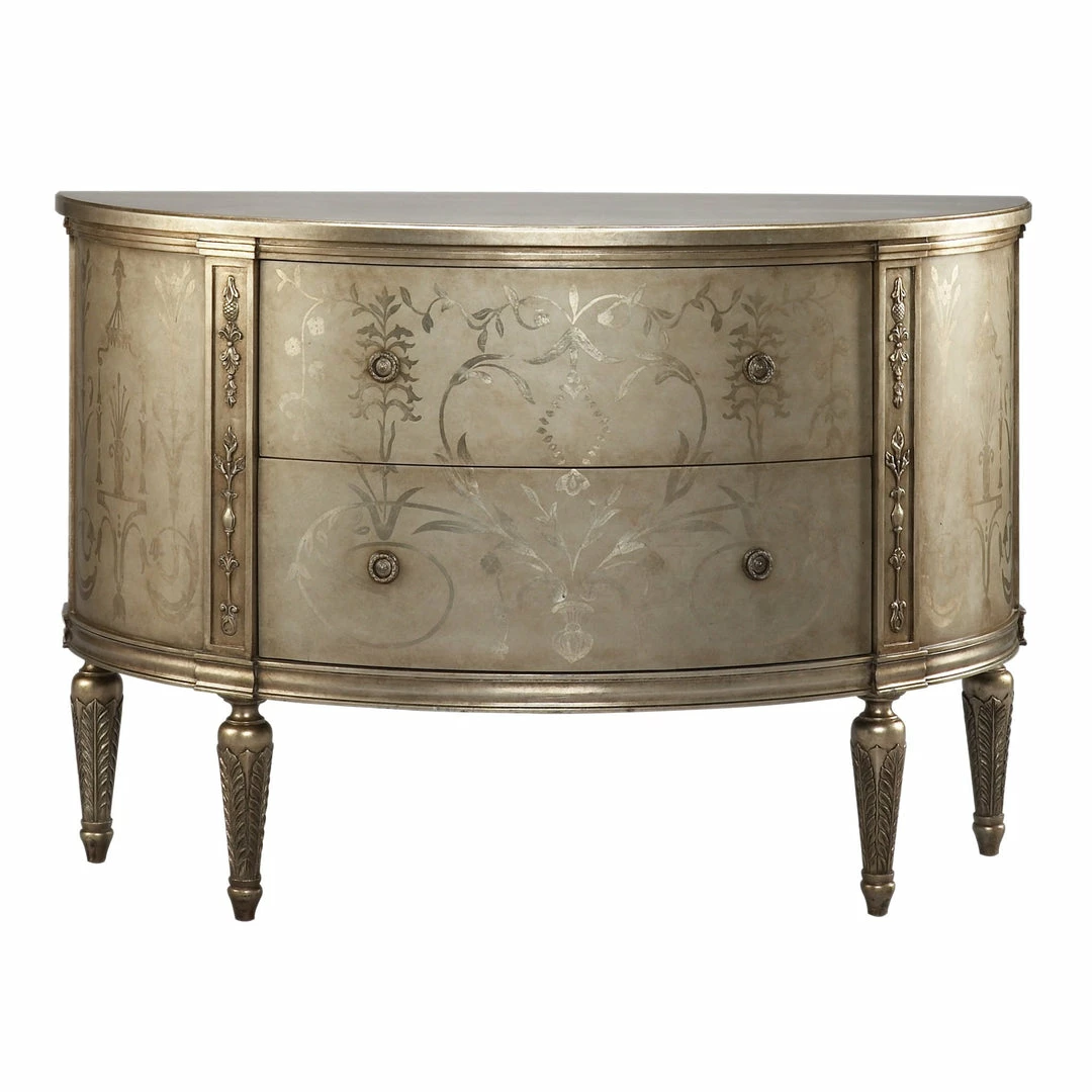 Antique Silver Leaf finish with hand painted decorative designs on panels and drawer fronts.