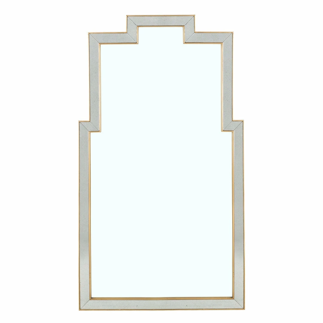 A beautiful blend of beveled, lightly antiqued, mirrored framing bordered with aged gold wood trim and surrounding a clear mirrored glass surface.