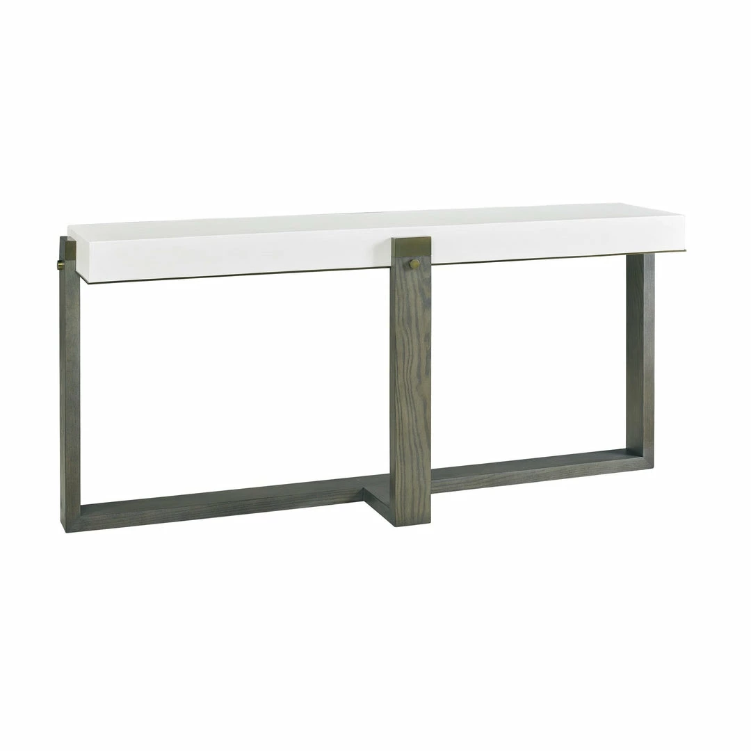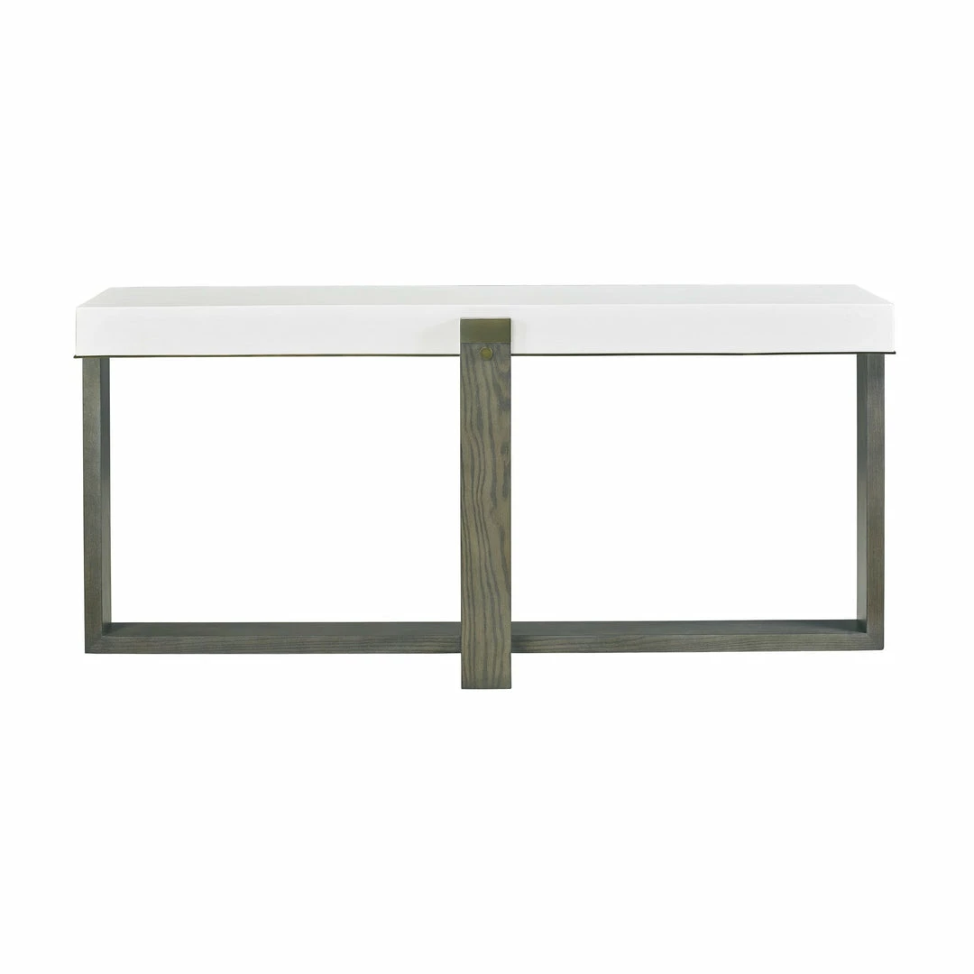 The Paolo Console features an oak frame in an amber grey finish supporting a white concrete top that is banded in aged brass matching the leg caps and hardware.