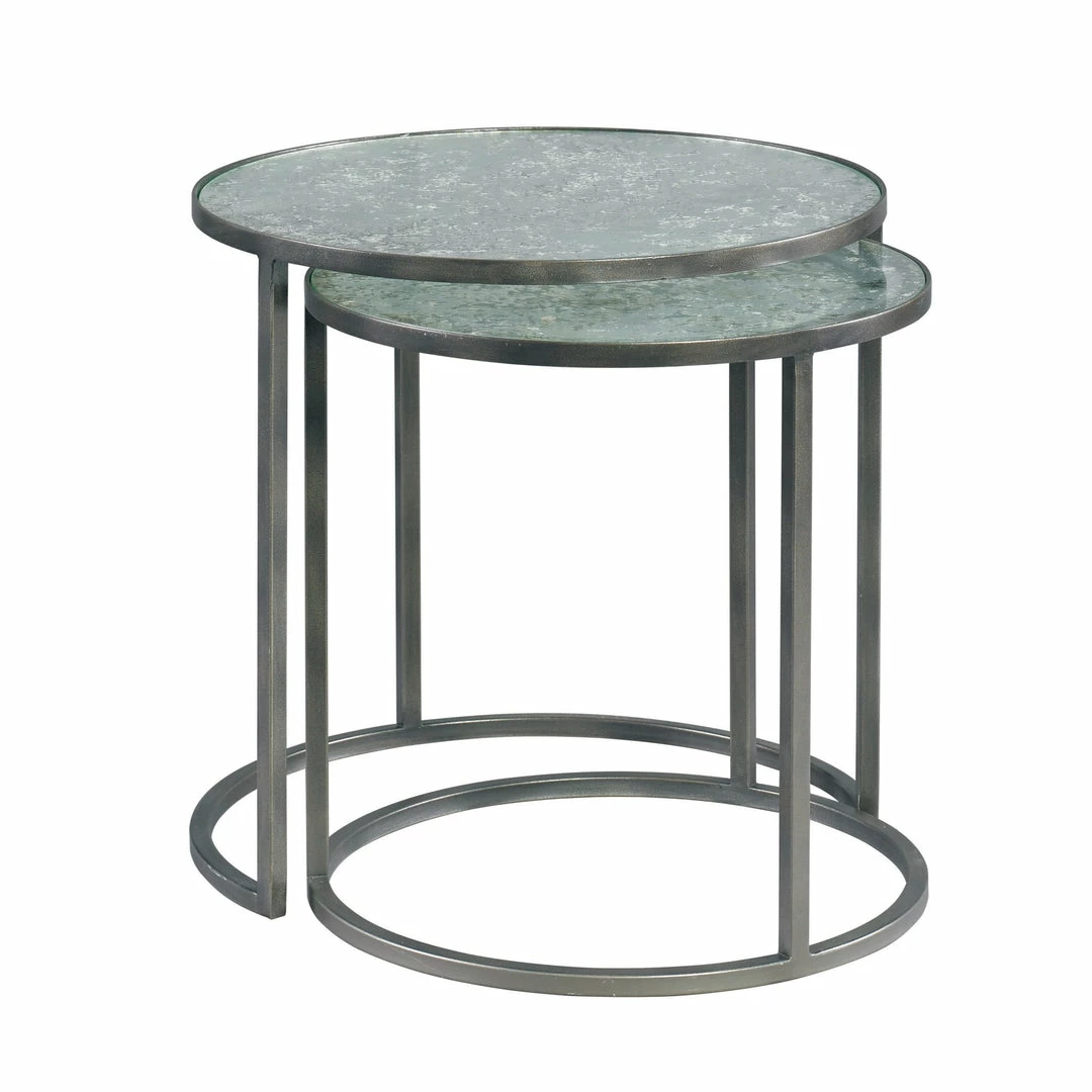 The two tables of this Riley Nested Side Table are solid welded steel in a natural gunmetal finish with inset tops of antiqued eglomise mirrored glass.