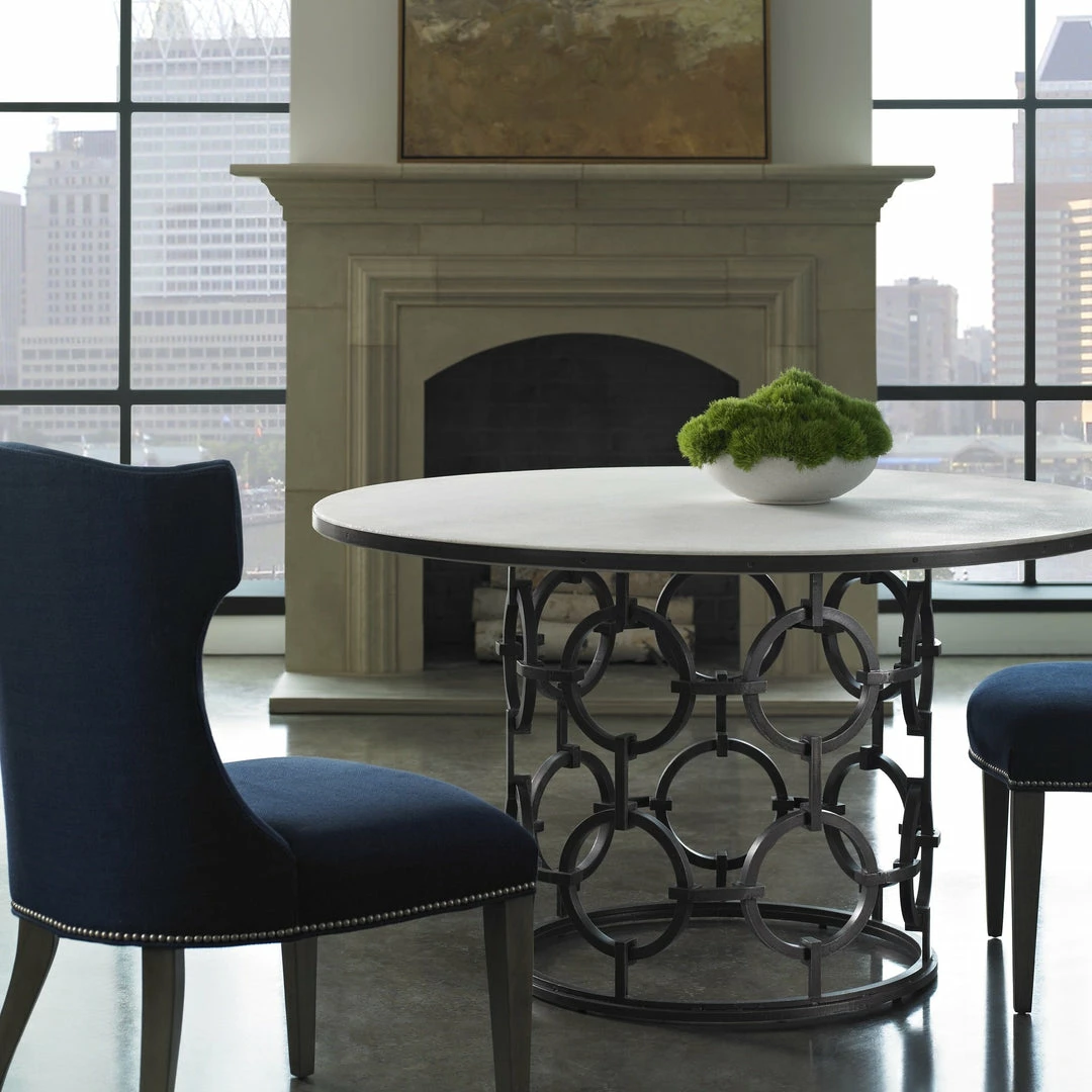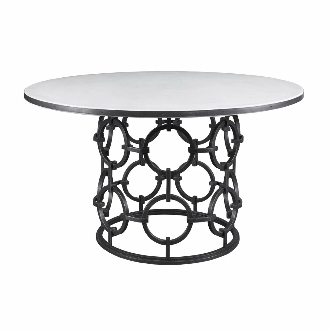A rustic finish defines this linked circle trellis design as a sophisticated opportunity. This sculptural design can easily function as a dining or game table with the addition of your choice of an optional stone or GL-54 or GL-60 glass top.