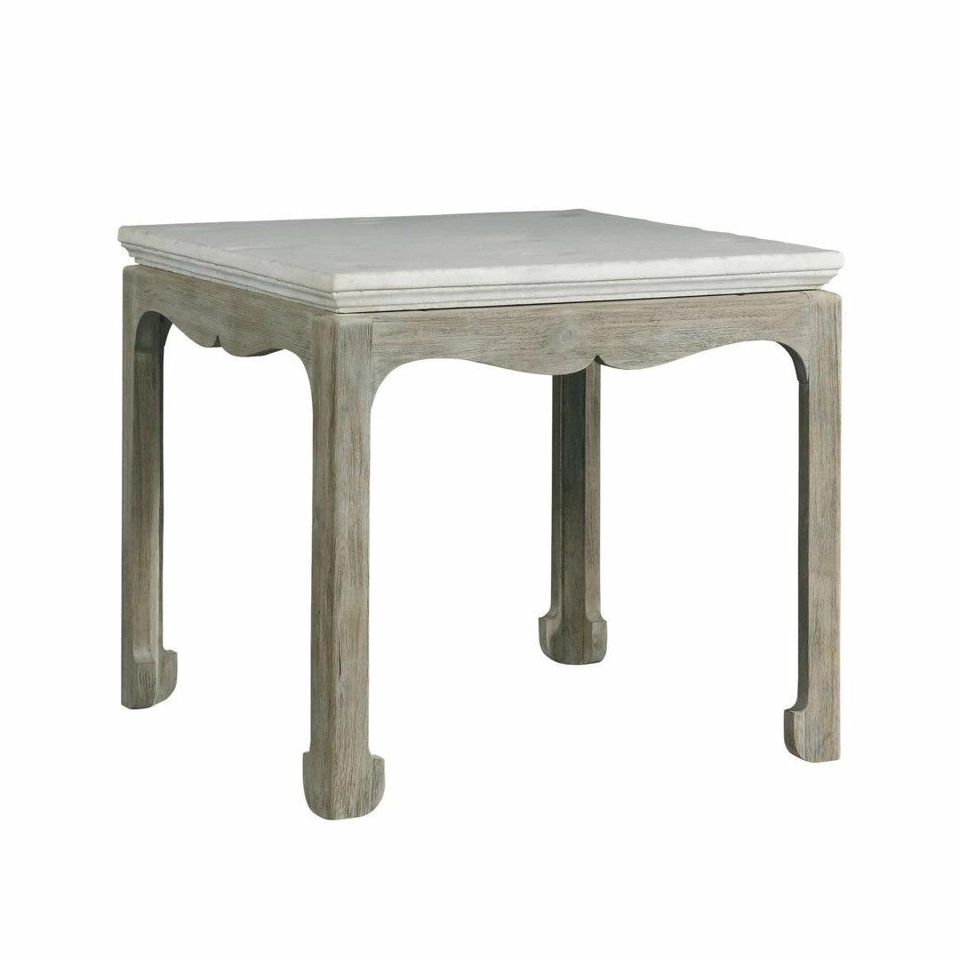 Weatherd wood, a worn stone top, and softly scalloped aprons bring the best of European styling to this nicely scaled and funtional side table.