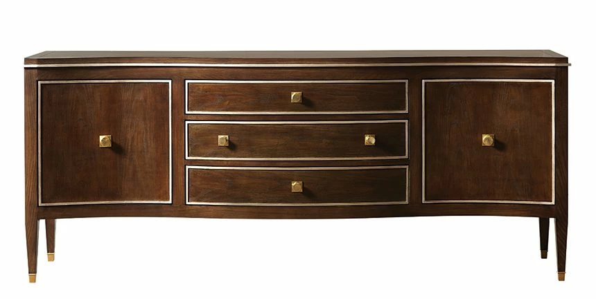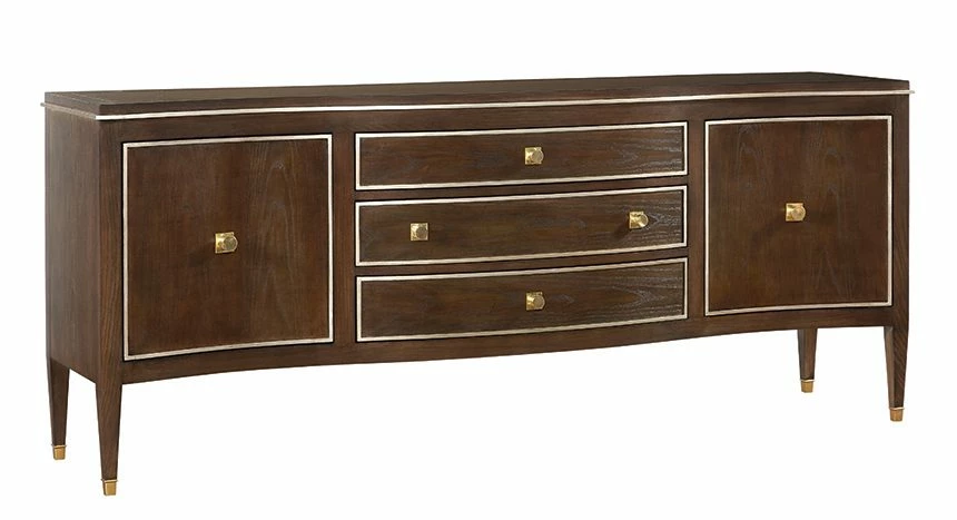 Three center drawers bordered by two doors with adjustable interior shelves featuring a bow front with tapered legs and ferrules.